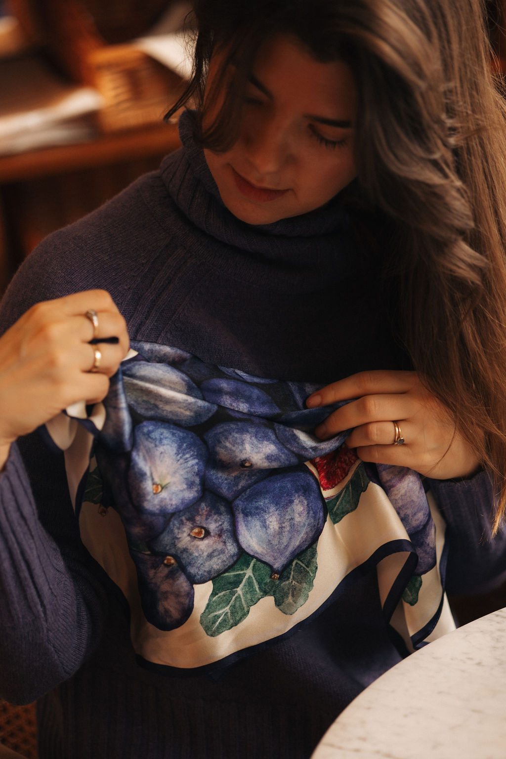 Odkryj kolekcjęRęcznie rolowany brzeg apaszki układa się miękko i naturalnie — bez sztywności, bez widocznego ściegu maszynowego. To różnica, którą wyczuą palce od pierwszego dotknięcia.